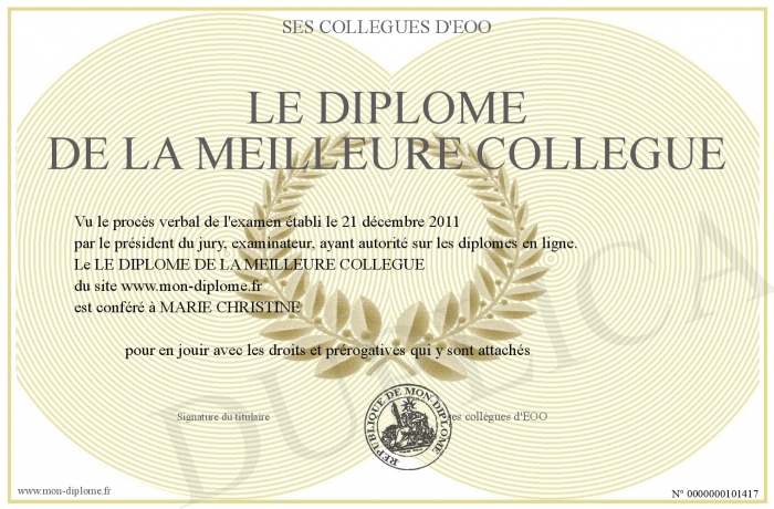 Envoyez par email votre LE DIPLOME DE LA MEILLEURE COLLEGUE personalisé