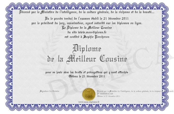 Envoyez par email votre Diplome de la Meilleur Cousine personalisé