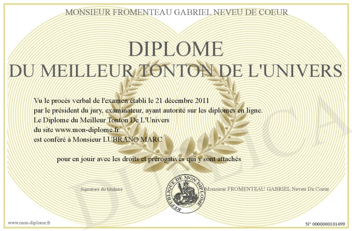 Envoyez par email votre Diplôme du Meilleur Tonton De L'Univers personalisé