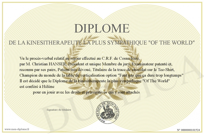 Envoyez par email votre Diplome de la kinésithérapeute la plus sympathique -Of The World- personalisé