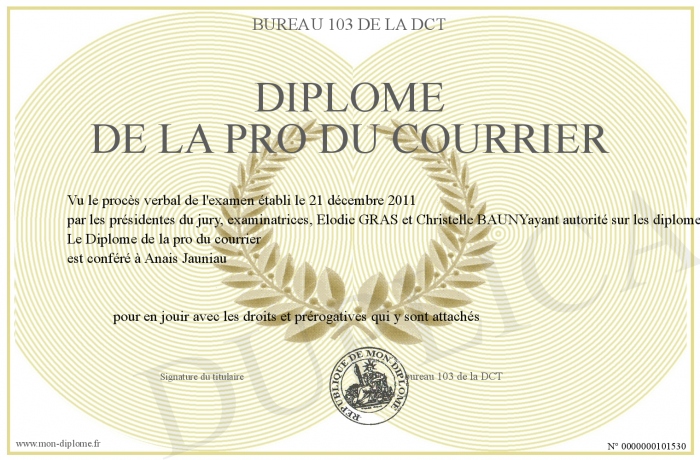 Envoyez par email votre Diplôme de la pro du courrier personalisé