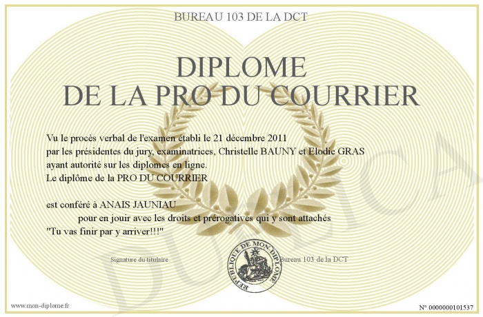 Envoyez par email votre Diplôme de la PRO DU COURRIER personalisé