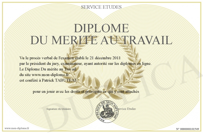 Envoyez par email votre Diplôme Du mérite au Travail personalisé