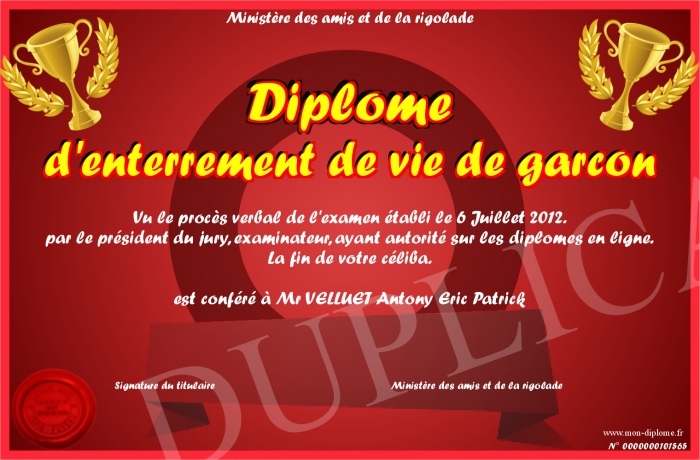Envoyez par email votre Diplôme d'enterrement de vie de garcon personalisé
