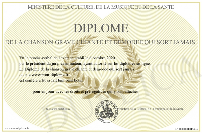 Envoyez par email votre Diplôme de la chanson grave chiante et démodée qui sort jamais. personalisé