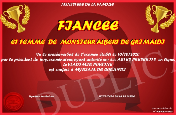 Envoyez par email votre FIANCEE ET FEMME DE MONSIEUR ALBERT DE GRIMALDI personalisé