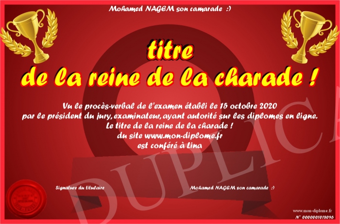 Envoyez par email votre titre de la reine de la charade ! personalisé