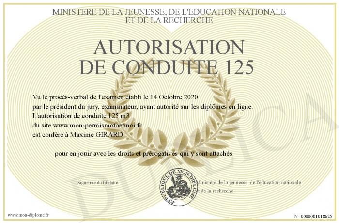 Envoyez par email votre AUTORISATION DE CONDUITE 125 personalisé