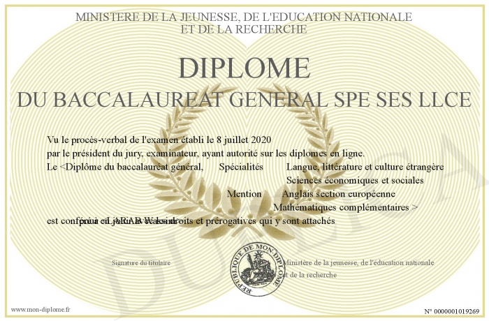 Envoyez par email votre Diplôme du baccalaureat général spé SES LLCE personalisé