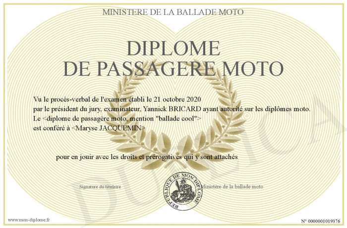 Envoyez par email votre Diplôme de Passagère moto personalisé