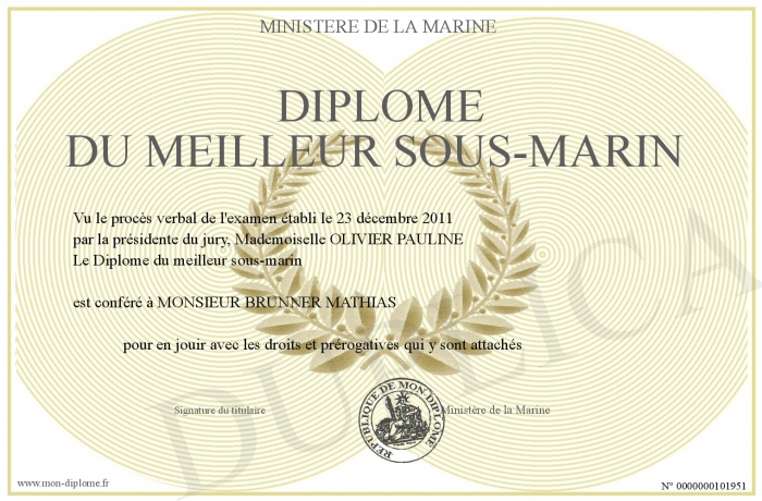 Envoyez par email votre Diplôme du meilleur sous-marin personalisé