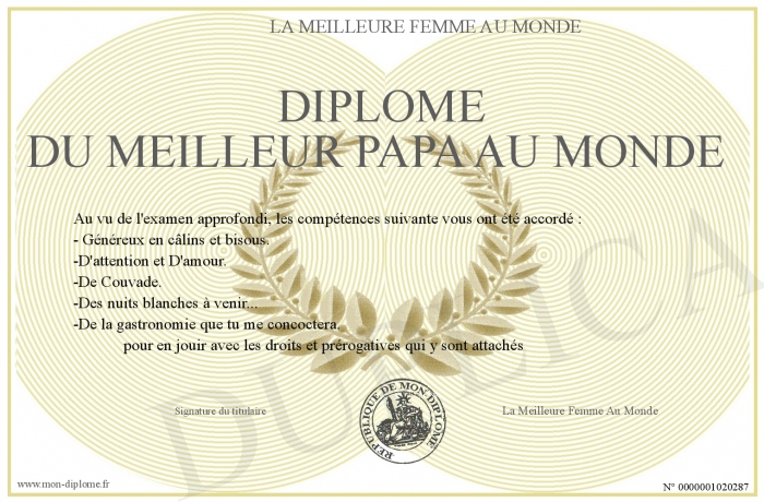 Envoyez par email votre Diplome du Meilleur Papa Au Monde personalisé