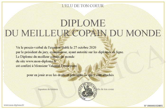 Envoyez par email votre Diplôme du meilleur copain du monde personalisé