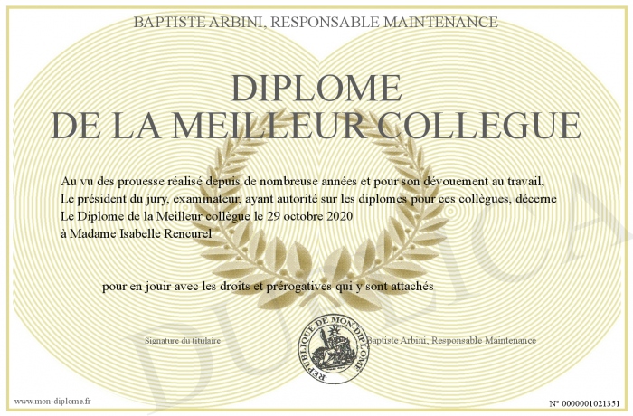 Envoyez par email votre Diplôme de la Meilleur collègue personalisé
