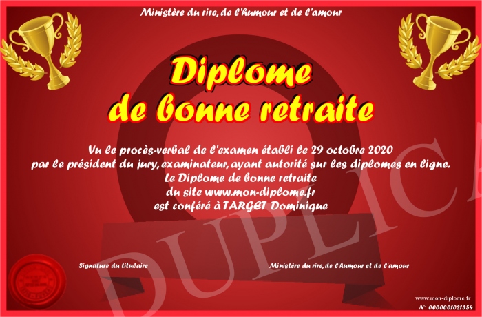 Envoyez par email votre Diplome de bonne retraite personalisé