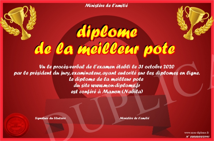 Envoyez par email votre diplome de la meilleur pote personalisé