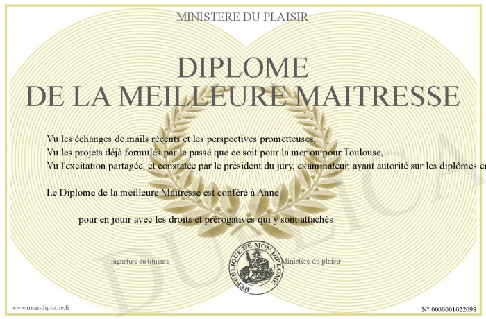 Envoyez par email votre Diplome de la meilleure Maitresse personalisé