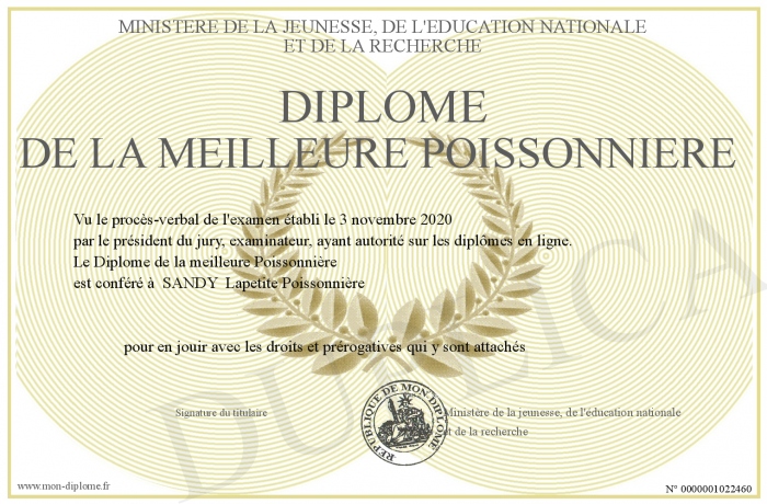Envoyez par email votre Diplôme de la meilleure Poissonnière personalisé