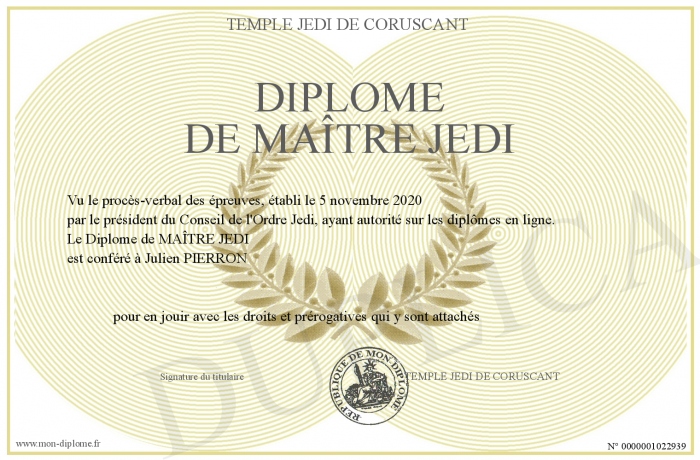 Envoyez par email votre Diplôme de MAÎTRE JEDI personalisé