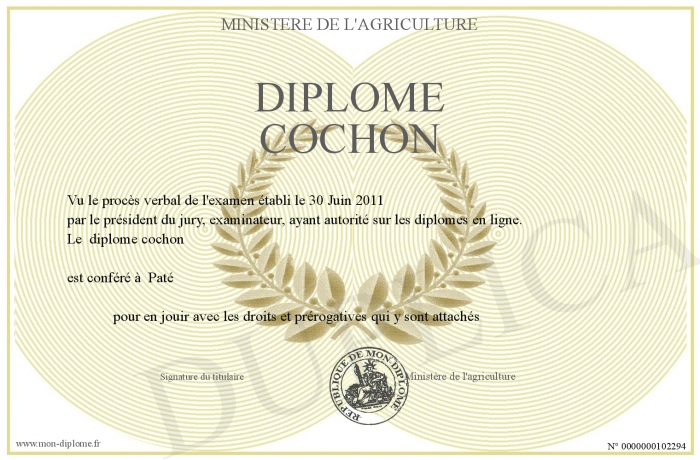 Envoyez par email votre Diplôme cochon personalisé