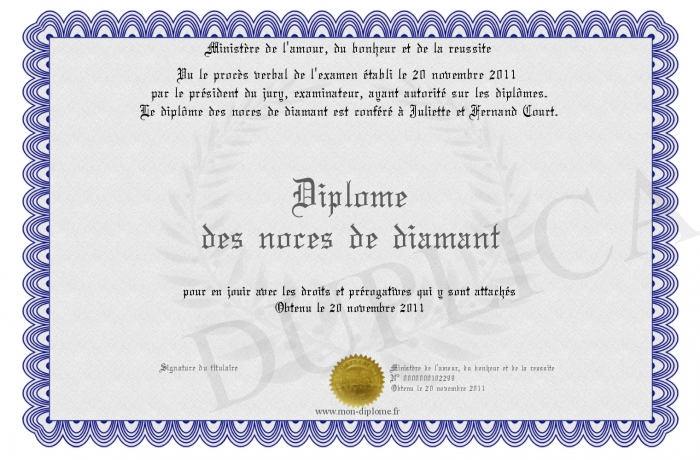 Envoyez par email votre Diplôme des noces de diamant personalisé