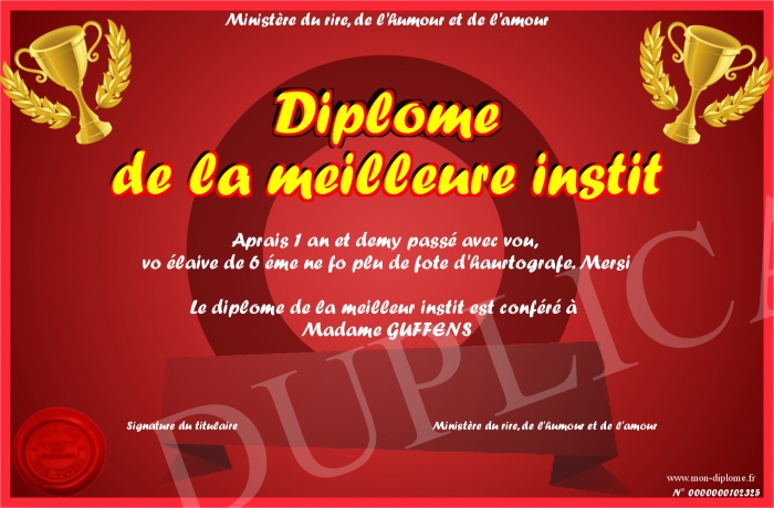 Envoyez par email votre Diplome de la meilleure instit personalisé