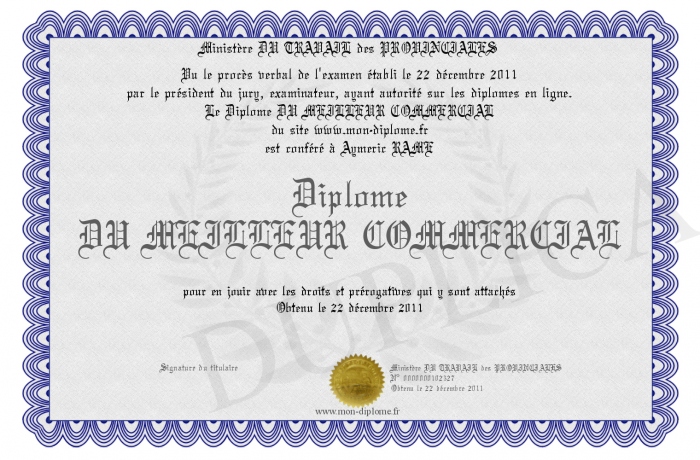 Envoyez par email votre Diplôme DU MEILLEUR COMMERCIAL personalisé