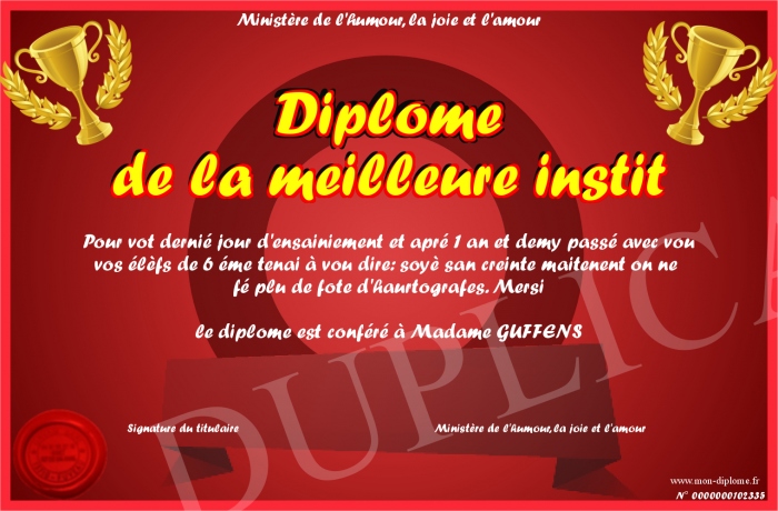 Envoyez par email votre Diplôme de la meilleure instit personalisé