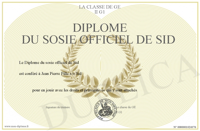 Envoyez par email votre Diplôme du sosie officiel de Sid personalisé