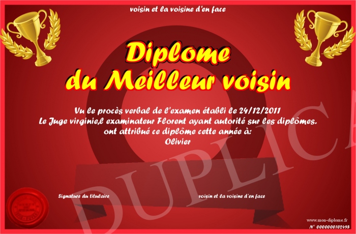 Envoyez par email votre Diplôme du Meilleur voisin personalisé