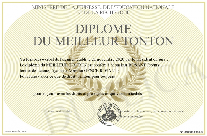 Envoyez par email votre Diplôme du meilleur TONTON personalisé