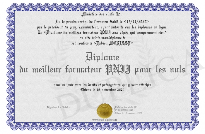 Envoyez par email votre Diplome du meilleur formateur PNIJ pour les nuls personalisé