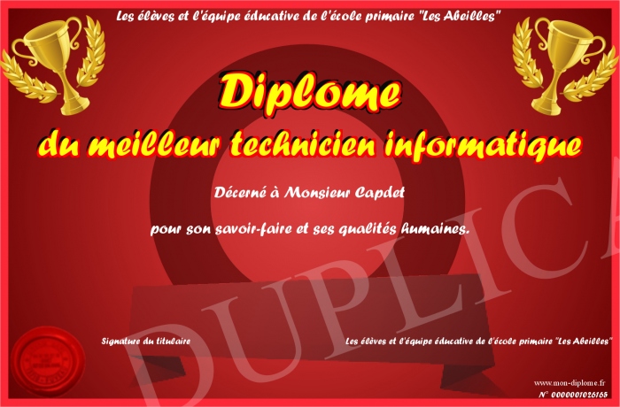 Envoyez par email votre Diplôme du meilleur technicien informatique personalisé