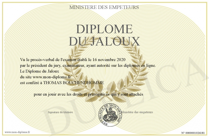 Envoyez par email votre Diplôme du Jaloux personalisé