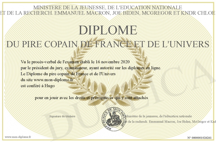 Envoyez par email votre Diplôme du pire copain de France et de l'Univers personalisé