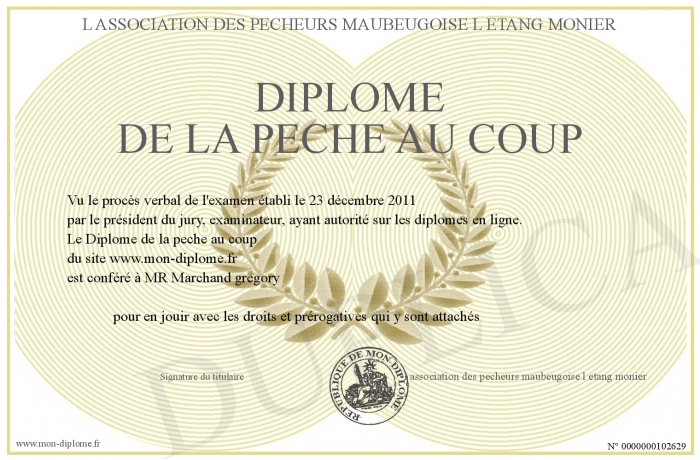 Envoyez par email votre Diplôme de la peche au coup personalisé