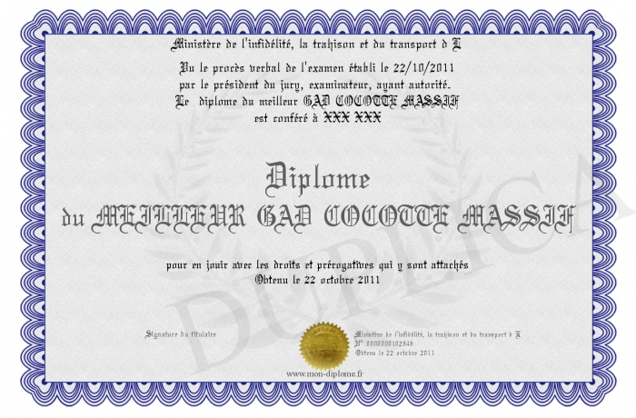 Envoyez par email votre Diplôme du MEILLEUR GAD COCOTTE MASSIF personalisé