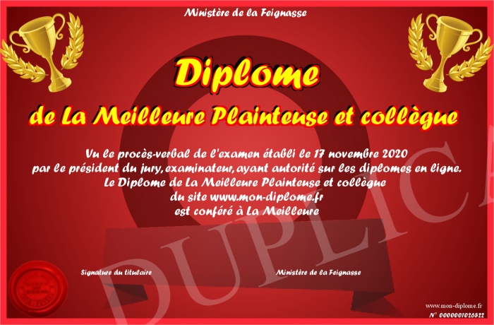 Envoyez par email votre Diplôme de La Meilleure Plainteuse et collègue personalisé