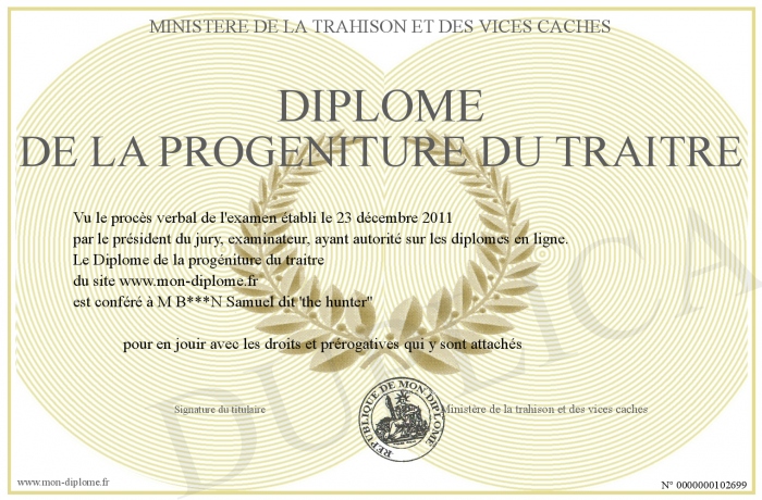 Envoyez par email votre Diplôme de la progéniture du traitre personalisé