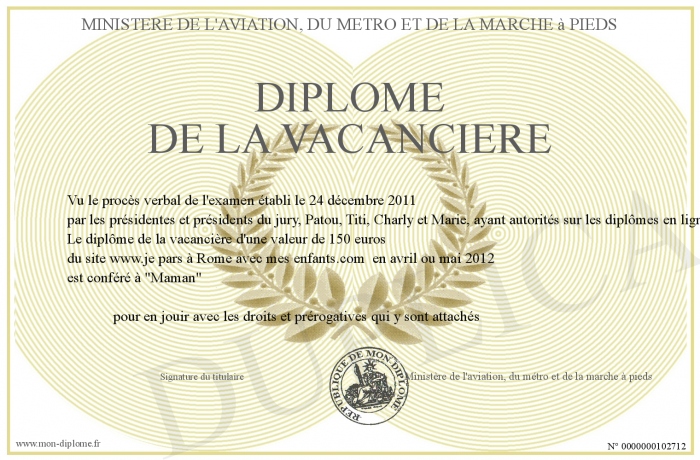 Envoyez par email votre Diplôme de la vacancière personalisé
