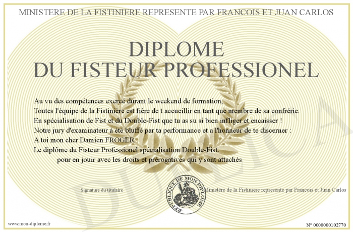Envoyez par email votre Diplôme du Fisteur Professionel personalisé