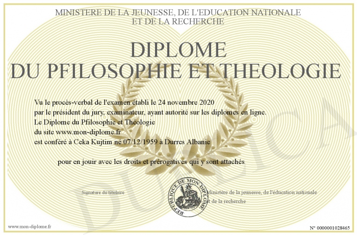 Envoyez par email votre Diplôme du Pfilosophie et Théologie personalisé