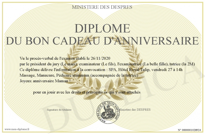 Envoyez par email votre Diplôme du bon cadeau d'anniversaire personalisé