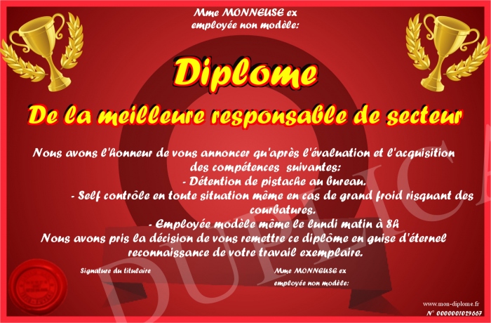 Envoyez par email votre Diplôme De la meilleure responsable de secteur personalisé