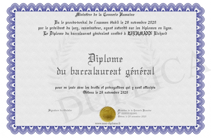 Envoyez par email votre Diplôme du baccalaureat général personalisé
