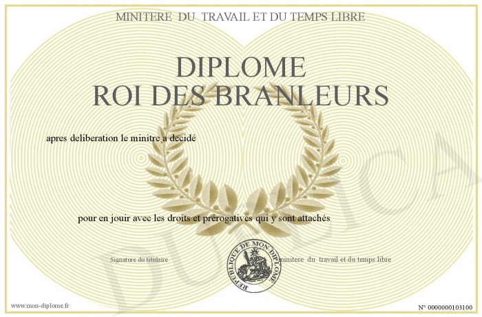 Envoyez par email votre Diplome roi des branleurs personalisé