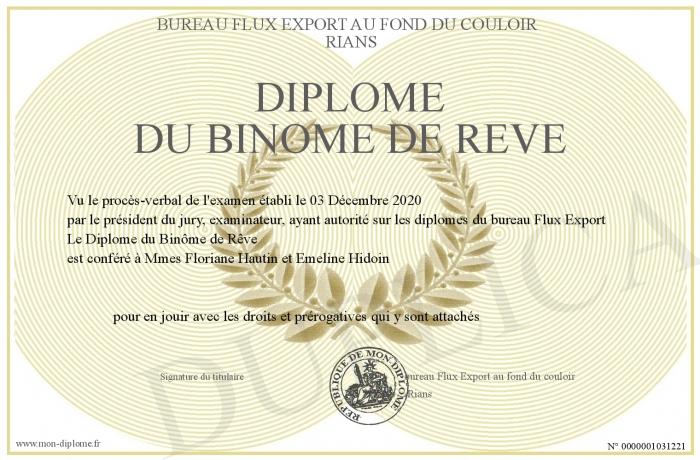 Envoyez par email votre Diplôme du Binome de reve personalisé