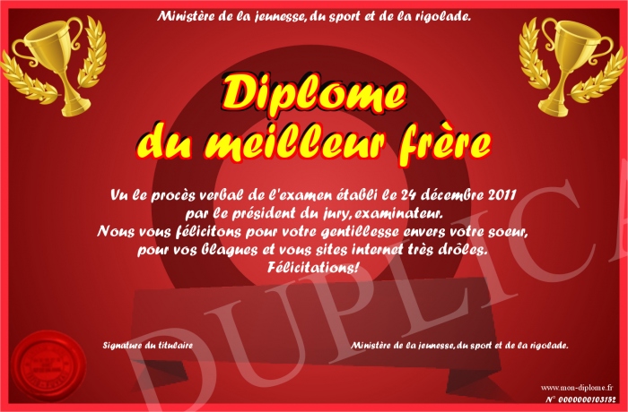 Envoyez par email votre Diplôme du meilleur frère personalisé