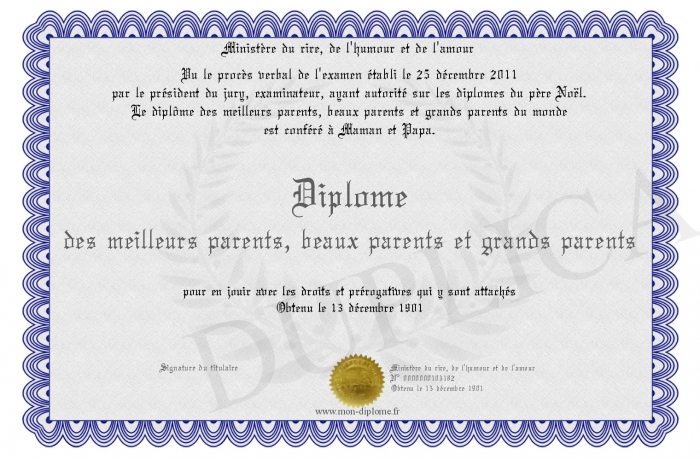 Envoyez par email votre Diplôme des meilleurs parents, beaux parents et grands parents personalisé
