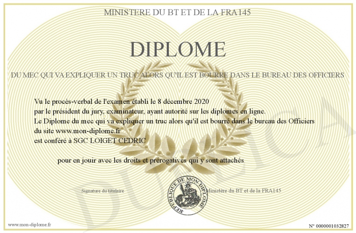 Envoyez par email votre Diplôme du mec qui va expliquer un truc alors qu'il est bourré dans le bureau des Officiers personalisé